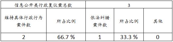 市51吃瓜 信息公开类行政复议案件3宗。其中,维持具体行政行为的2宗,占66.7%;依法纠错的1宗,占33.3%;其他情形0宗,占0%。