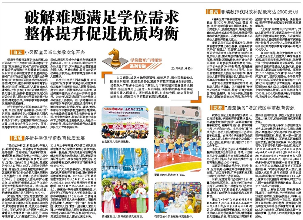 人口翻番、城区土地资源紧张、编制不足、居住区配套幼儿园接收问题等,这些都是各区发展学前教育普遍遇到的问题。记者深入广州多个区采访了解到,为了有效增加普惠性幼儿园学位,各区迎难而上,通过一系列举措,使得学位数基本能满足适龄儿童入园需求。通过园本教研、打造特色园、建立互助帮扶等办法,促进区内学前教育优质均衡发展。