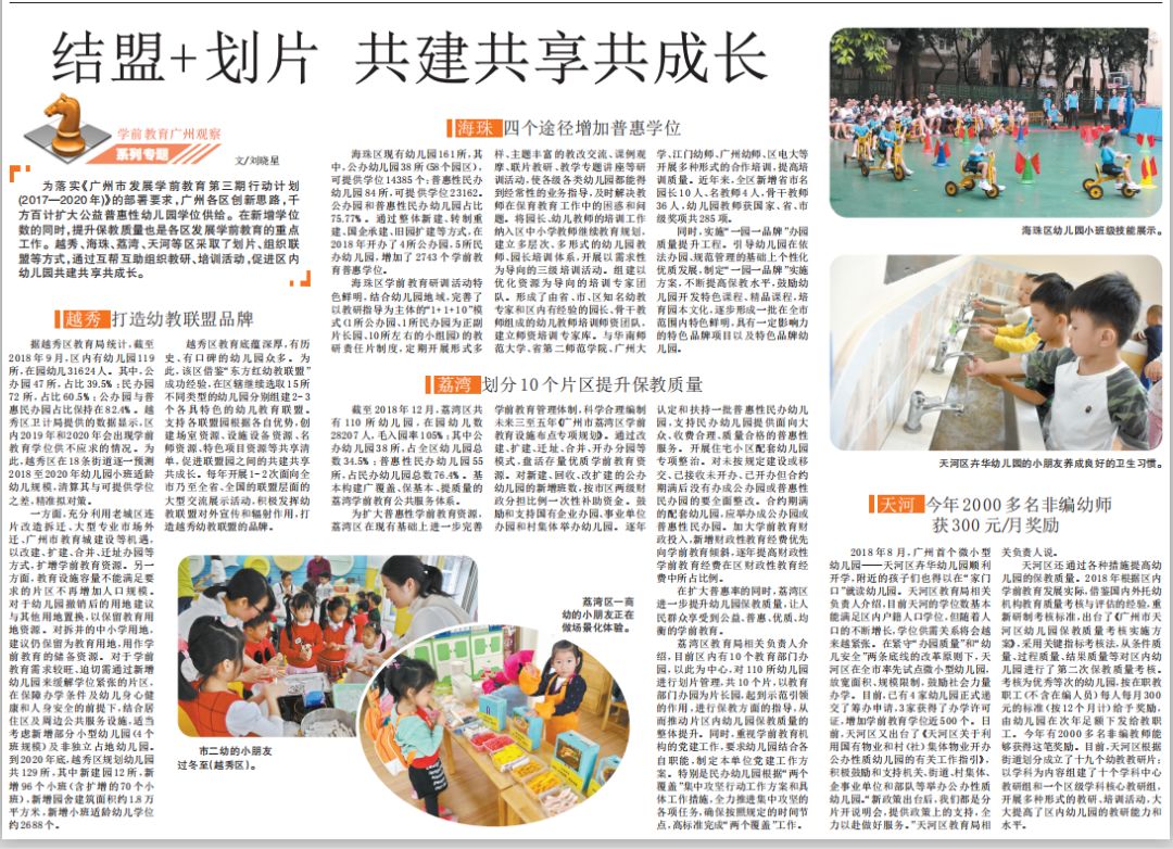 为落实《广州市发展学前教育第三期行动计划(2017—2020年)》的部署要求,广州各区创新思路,千方百计扩大公益普惠性幼儿园学位供给。在新增学位数的同时,提升保教质量也是各区发展学前教育的重点工作。越秀、海珠、荔湾、天河等区采取了划片、组织联盟等方式,通过互帮互助组织教研、培训活动,促进区内幼儿园共建共享共成长。