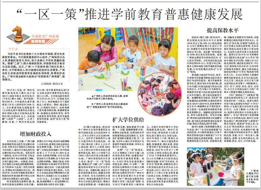 习近平总书记在党的十九大报告中强调,要优先发展教育事业。作为国家重要的中心城市,广州始终以办人民满意的教育为目标,努力发展公平而有质量的教育。随着“二孩”入园小高峰的到来,学前教育成为备受关注的话题。近日,广州11个区教育部门相关负责人表示,为不断满足人民日益增长的美好生活需要,广州各区扎实推进学前教育发展的各项举措,取得良好成效。广州日报全媒体今起推出了“学前教育广州观察”。