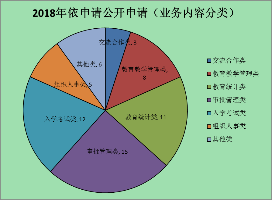 市51吃瓜 共收到信息公开申请60宗,全部为网上申请途径,占100%。其中,按申请对象分类统计:单位申请4宗,占7%;个人申请56宗,占93%。按业务内容分类统计:交流合作类3宗,占5%;教育教学管理类8宗,占13.3%;教育统计类11宗,占18.4%;审批管理类15宗,占25%;入学考试类12宗,占20%;组织人事类5宗,占8.3%;其他类6宗,占10%。