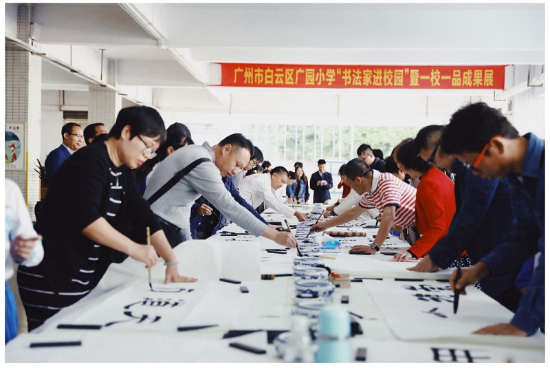 白云区教育系统与区文联现场签订了“书法进校园”战略合作协议,并为“书法进校园”第一批书法家颁发聘书,为“书法进校园”第一批共20所试点学校颁发牌匾。签约仪式结束后,“书法进校园”第一批书法家书法作品在广园小学校园进行展览,书法家现场观摩指导学生写书法,打响了“书法进校园”活动第一枪。
