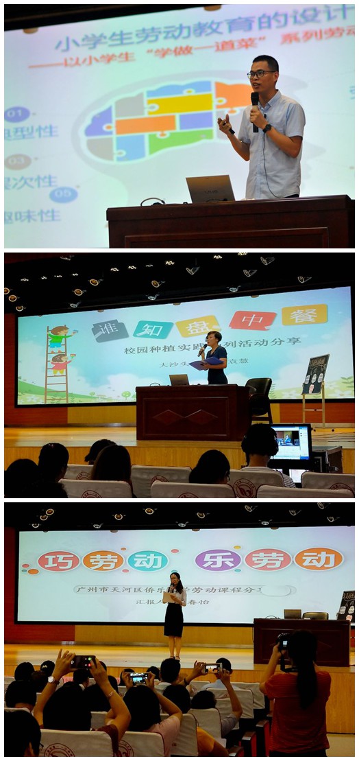 微讲座部分,来自天河区员村小学的温春来老师、越秀区大沙头小学的袁慧老师和天河区侨乐小学的陈春怡老师分别进行了《独立是为了分享——“学做一道菜”劳动系列实践活动》《谁知盘中餐——校园种植实践系列活动》《巧劳动、乐劳动——学校劳动教育系列课程》的分享,介绍了学校层面和班级层面劳动教育的实践经验,为劳动教育生活化、系列化、课程化带来了可操作性的范例,展示了广州市一线班主任在探索广州劳动教育特色方面所取得的成果。