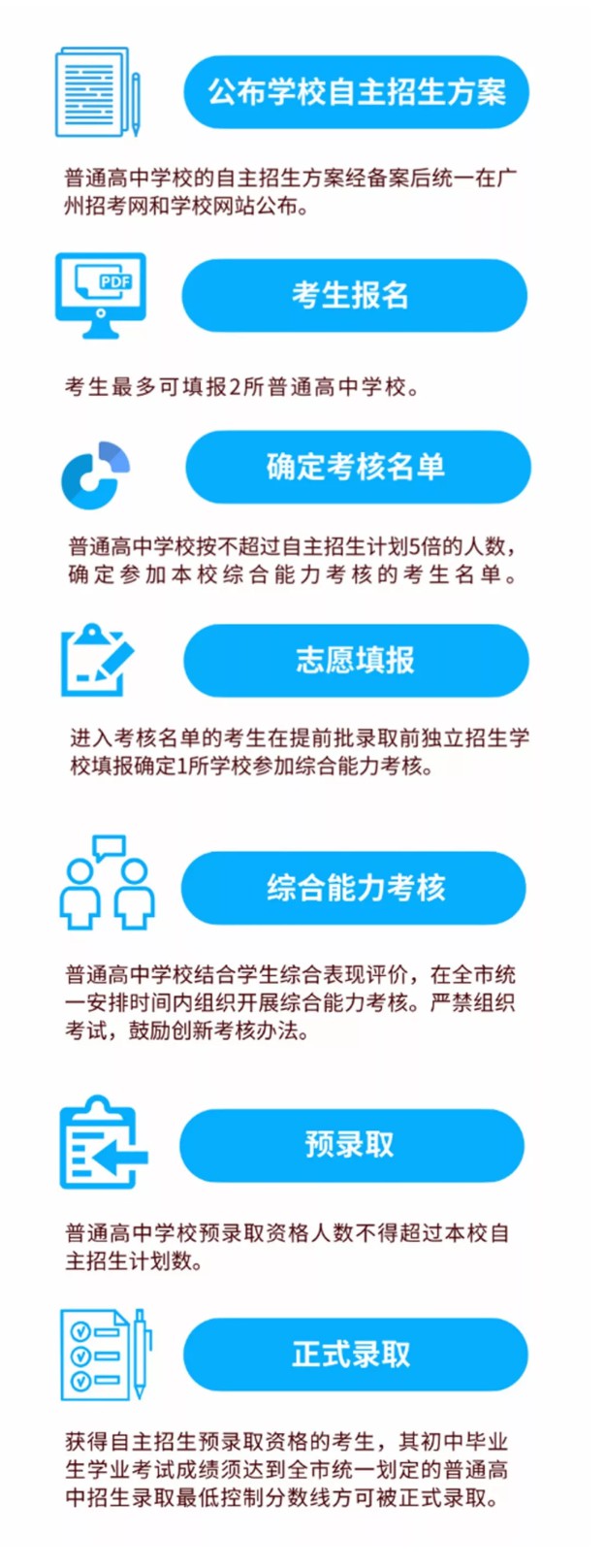 实施自主招生是全面贯彻党的教育方针,落实立德树人根本任务,克服唯分数论,深化高中阶段学校考试招生制度改革的重要举措。为满足有学科特长和不同潜质学生的发展需要,激发普通高中学校办学活力,推动高中阶段学校多样化特色发展,根据《教育部关于进一步推进高中阶段学校考试招生制度改革的指导意见》(教基二〔2016〕4号)关于“要给予有条件的高中阶段学校一定数量的自主招生名额”的精神,以及《51吃瓜 印发<关于2019年至2020年广州市高中阶段学校考试招生的工作意见>的通知》(穗教规字〔2018〕5号)关于“经批准的示范性普通高中可试行自主招生”的要求,市51吃瓜 印发实施《关于2019年广州市普通高中学校试行自主招生的通知》(以下简称《通知》)。