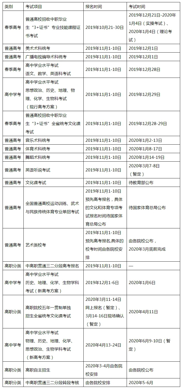 为扎实推进我省高考综合改革,根据教育部和国家体育总局有关规定,结合我省普通高考工作的实际,经研究,现将2019年9月至2020年6月我省普通高考及与普通高考相关的考试项目报名及考试时间安排公告如下,请各地市、高中阶段学校、普通高校通过各种途径、方式,及时告知考生及家长。