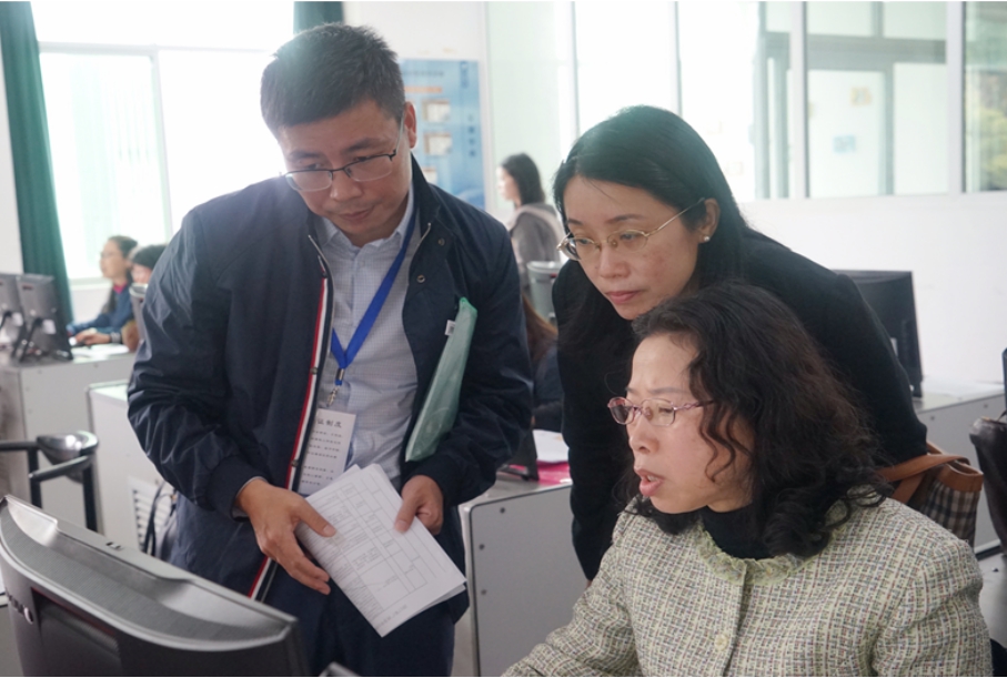 市教育评估和教师继续教育指导中心行政负责人邓静红(左二)在检查2018年市中小学教师继续教育项目网上评审工作,与专家亲切交谈。