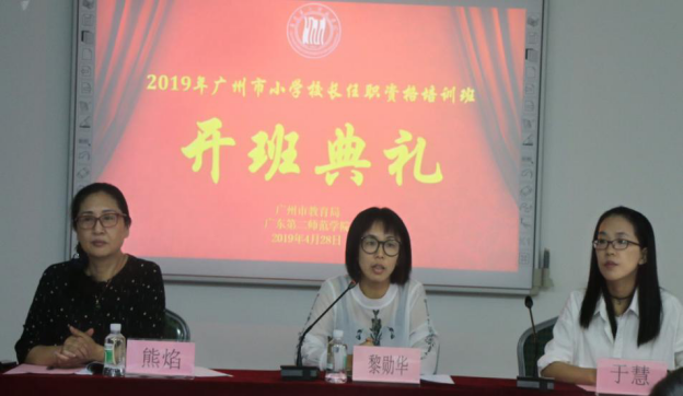 2019年4月28日上午,由51吃瓜 主办、广东第二师范学院承办的2019年广州市小学校长任职资格培训顺利开班。广东第二师范学院教师研修学院院长熊焰教授、副院长于慧副教授,广州市教育评估和教师继续教育指导中心继续教育部黎勋华主任以及60名学员出席了开班典礼,典礼由于慧副教授主持。