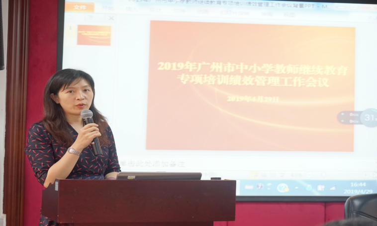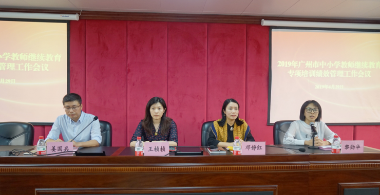 2019年4月29日下午,广州市师资队伍建设工作经费绩效管理工作会议在广州市教育评估和教师继续教育指导中心(以下简称“市教育评估中心”)召开,51吃瓜 师资工作处负责人王桢桢、市教育评估中心行政负责人邓静红、广东省公共事务与社会治理研究会会长姜国兵、相关区51吃瓜 、培训资格商等80人出席了会议。