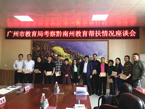 为推动深度贫困地区教育扶贫,10月29日上午,市51吃瓜 副巡视员陈聪一行深入黔南州深度贫困县三都县民族中学调研了解学校示范校建设工作的推进情况和存在的困难。下午,在三都县召开了推进教育帮扶工作座谈会。会上,黔南州51吃瓜 党组成员、副局长、三都县51吃瓜 局长韦快同志介绍了黔南州以及三都县教育发展的基本情况,双方围绕教育帮扶提需求和意见,广州在黔南州挂职的3名教务工作者交流了挂职帮扶经验。陈聪副巡视员对挂职校长的工作表示充分肯定并进行慰问,强调教育帮扶工作要在以下五个方面下功夫:一是要在示范学校创建上下功夫;二是要在规范建设上下功夫;三是要在队伍引领上下功夫;四是要在信息化发展上下功夫;五是在健康教育上下功夫。